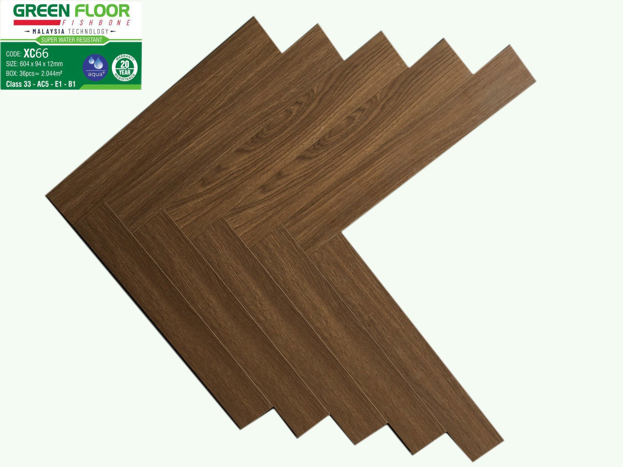 Sàn gỗ Greenfloor 12mm lát xương cá có kích thước: 604x94x12mm.
