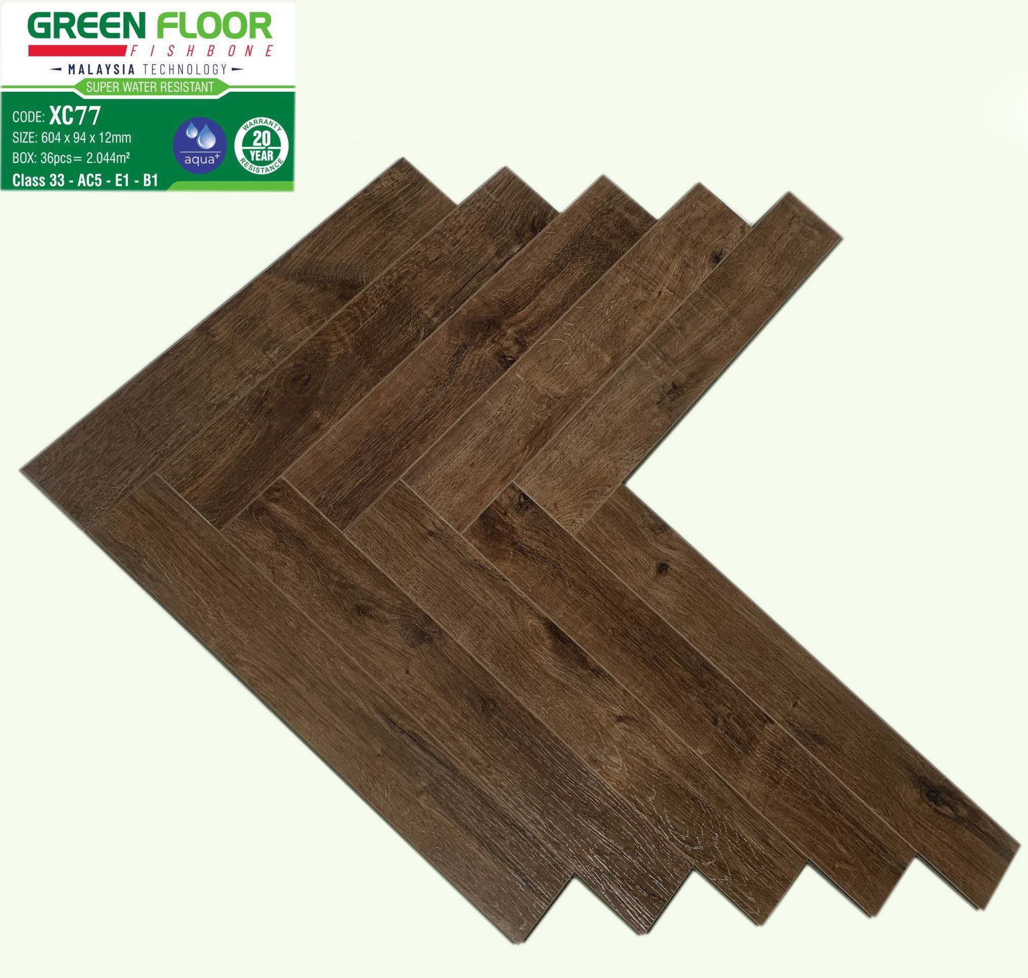 Sàn gỗ Greenfloor 12mm lát xương cá có kích thước: 604x94x12mm.
