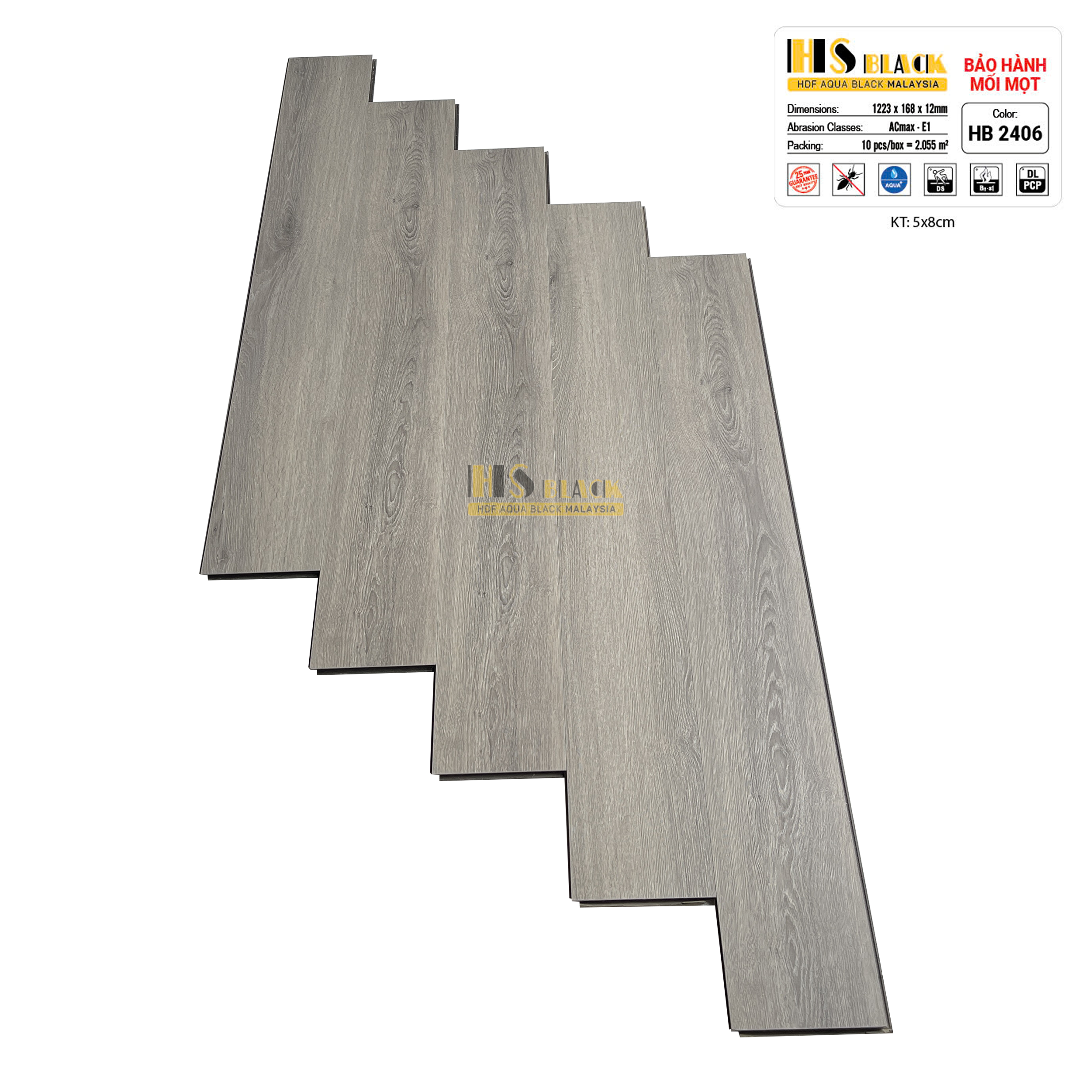 Sàn gỗ cốt đen có kích thước: 1223×168x12mm. Quy cách: 1 hộp/10 thanh/2.055m2.