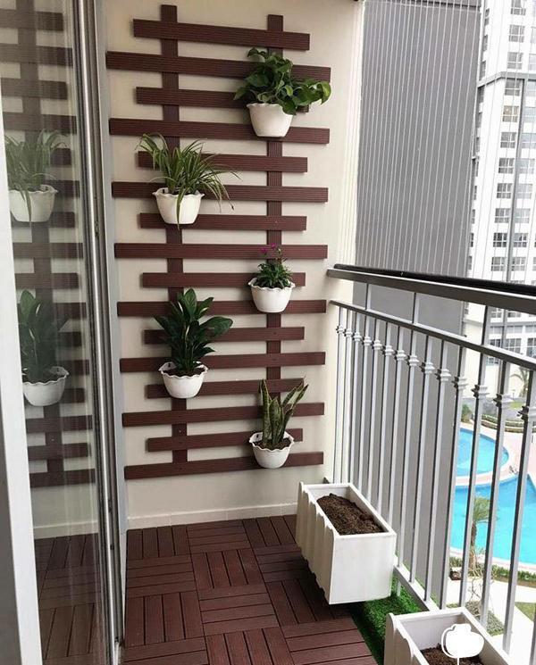 – Phần trang trí tường ban công thường được làm từ các thanh Vật tư gỗ nhựa ngoài trời thường là thanh gỗ nhựa 70x12mm đan theo đường ngang dọc hoặc hình ô quả trám, kết hợp với các chậu hoa treo ở trên: